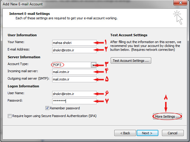- Account Type (گزینه ی POP3 را انتخاب کنید)